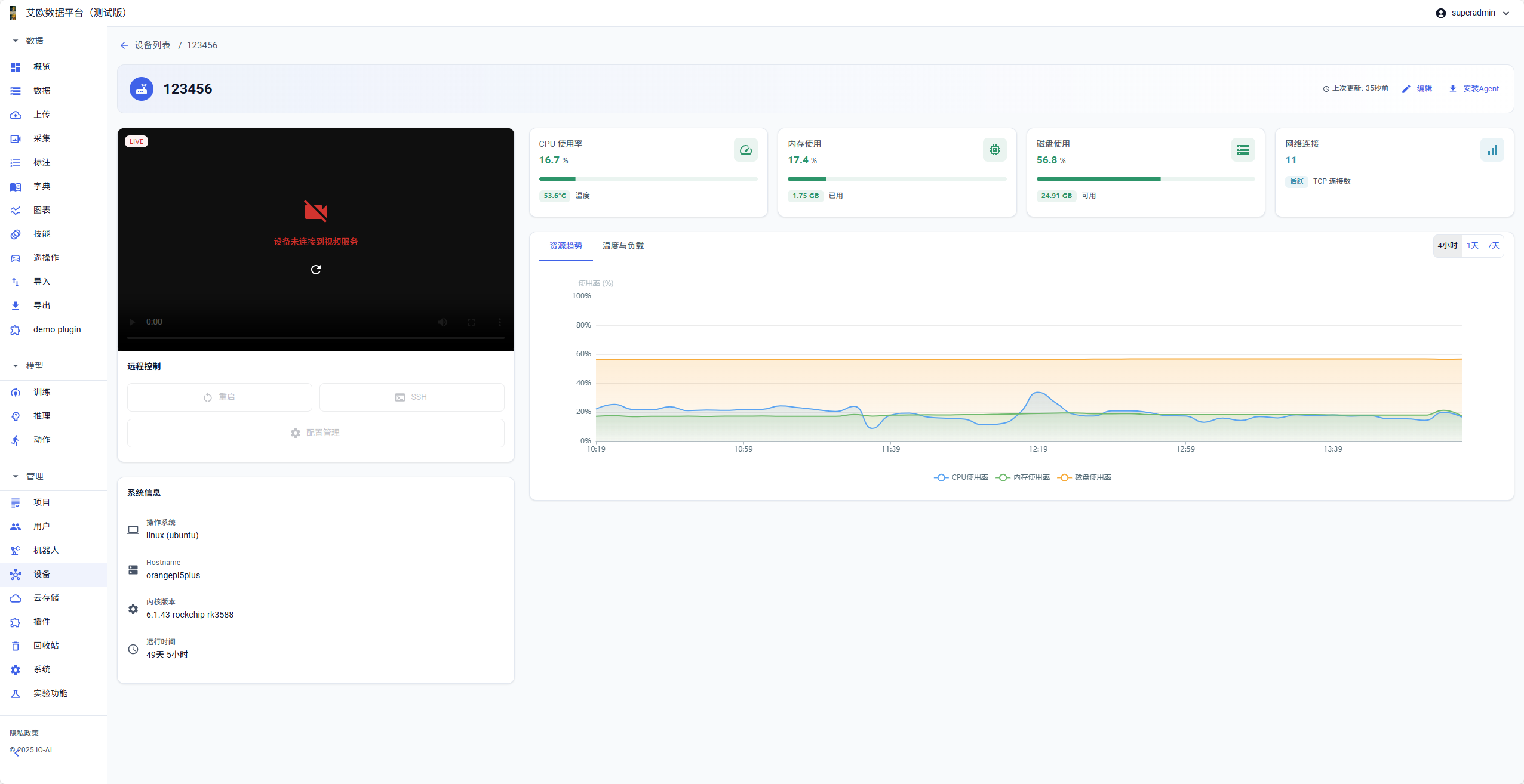 デバイス管理は艾欧データプラットフォームのコアデバイス監視・管理モジュールで、ロボットデバイスの全ライフサイクル管理機能を提供します。Agentクライアントプログラムを通じて、プラットフォームはデバイスの動作状態とリソース使用状況をリアルタイムで監視し、ビデオストリームにアクセスしてリモートビジュアル監視を実現し、リモート引き継ぎ機能を提供することで、管理者、プロジェクトマネージャー、コレクターが分散デバイスを効率的に管理し、デバイスの安定動作とデータ収集タスクの円滑な進行を確保します。