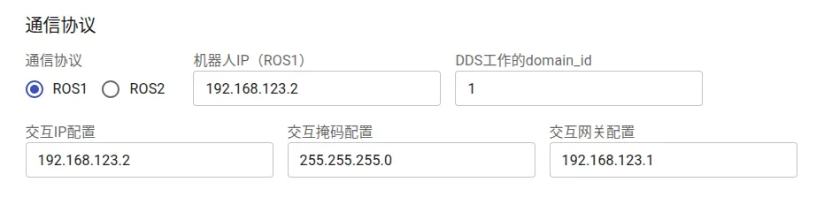 - 机器人IP(ROS1模式下):指定机器人工控机在 ROS1 模式下的 IP 地址。